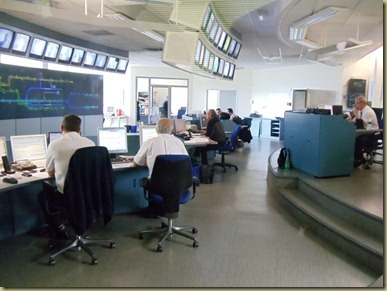 We visited the tramway garages, designed by architect Jacques Ferrier. It has three buildings; the first one has the repair shops and the control room, where all units are looked after. The second one is the service station, where the unit is plugged into a huge vacuum in order to clean it and the last one is where the vehicles are parked at the end of the day. In the control room there is people working twenty-four hours a day. In the first three desks are the controllers for the three lines. They verify that tramways are on time and they can control the lines’ power supply. The localization of every single unit can be seen on the big board in front of them where the three lines are drawn. Yellow buses represent trams that are on time, green buses if they are in advance or red buses if they are late. In the back there is the person in charge of safety, who calls the police, the firemen or the ambulance according to what is needed, and that’s where you can find the lady who does the voice-over messages played in the units and the stations in case of disturbances.